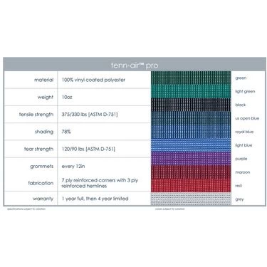 Product Details: 10 ounce 100% vinyl coated polyester Half moon air vents every 10′ 7-ply reinforced corners and 3-ply reinforced hems with built-in grommets every 12 inches 78% shade factor Available in Black, Forest Green, Royal Blue, or US Open Blue.
