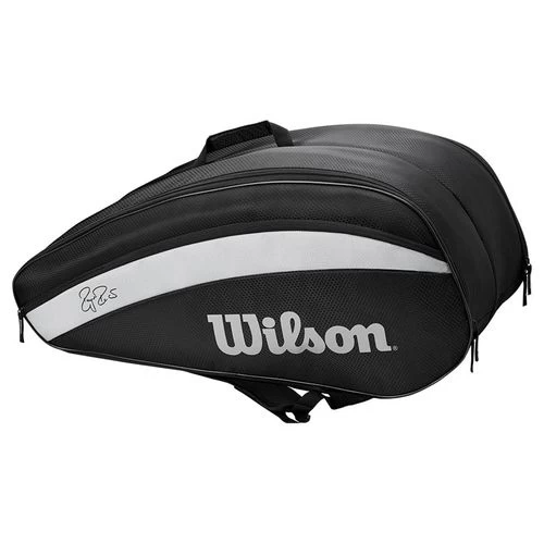 Grab the latest Federer Team 12 Pack bag today! This awesome Roger Federer Team from Wilson Sports, features two large main compartments which have the ability to hold up to 12 uncovered racquets. The bag also features two exterior side pockets for personal storage. Comfortable carry with grab handle and comfortable padded adjustable backpack straps. Screen printed Roger Federer’s signature featured.